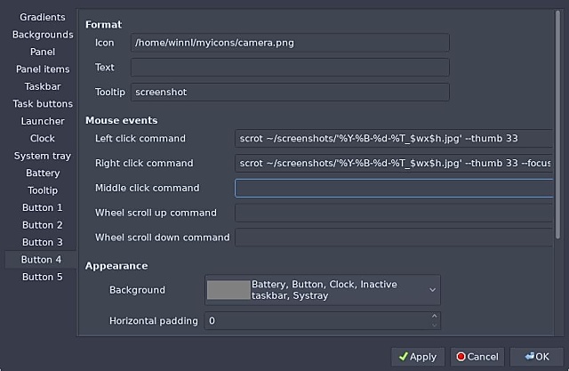 Der Button für den Kommandozeilen screenshooter SCROT, linker Mausklick generiert ein Screenshot des gesamten Bildschirmes inklusive Thumbnail, das ich für Vorschaubilder in Foren und auf meinem Blog benutze und rechter Mausklick dann nur ein Screenshot des aktiven Programm Fenster. Die Bilder werden dabei im Verzeichniss ~/screenshots/ gespeichert