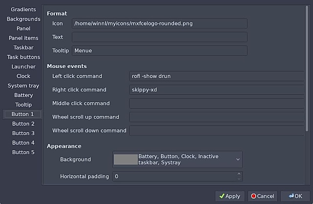 und bei dem Button für das Menü mit Rofi ist zusätzlich skippy-xd eingebunden