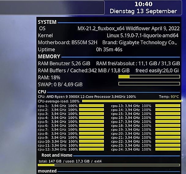 Das Bild zeigt das System unter Vollast beim Erstellen des Snapshots, in der Kompressionsphase. Schön zu sehen, wie die Last auf die Kerne/Threads verteilt wird.