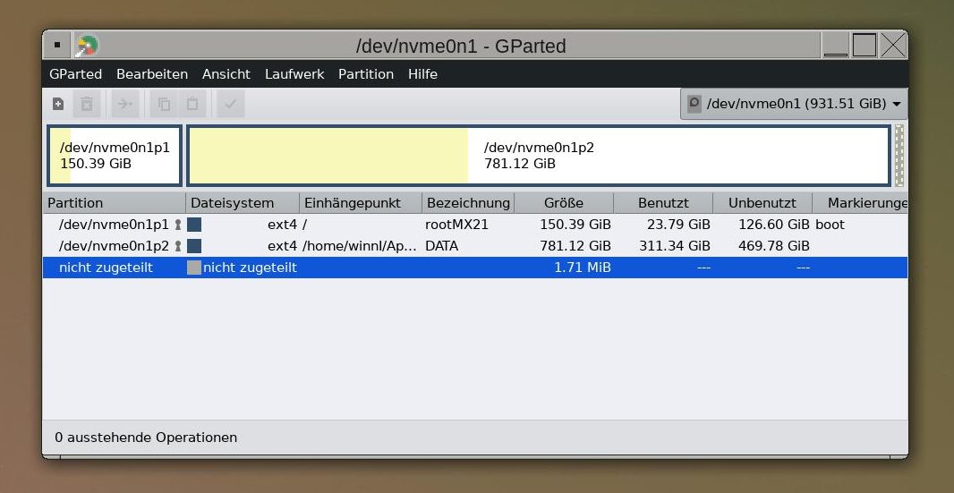 der relevante Teil sieht ähnlich aus /media/DATA/Apps /home/winnI/Apps none bind 0 0Dadurch hat man alle "Platzfresser" schon mal aus der Sicht von mx-snapshot entfernt und bekommt ein relativ kompaktes Systembackup (Programme und Konfigurationen), dass bei mir immer noch auf einen 8GB Stick passt, während die Daten separat mit Grsync (oder was immer man persönlich bevorzugt) gehandhabt werden und z.B. auf die zweite Platte geschrieben werden. Für Backup Paranoiker wie mich geht dann der Weg weiter von dieser zweiten Platte auf mehrere externe Festplatten, je nach Umfang der Änderungen zwischen täglich (selten) bis 1x wöchentlich (fast immer).