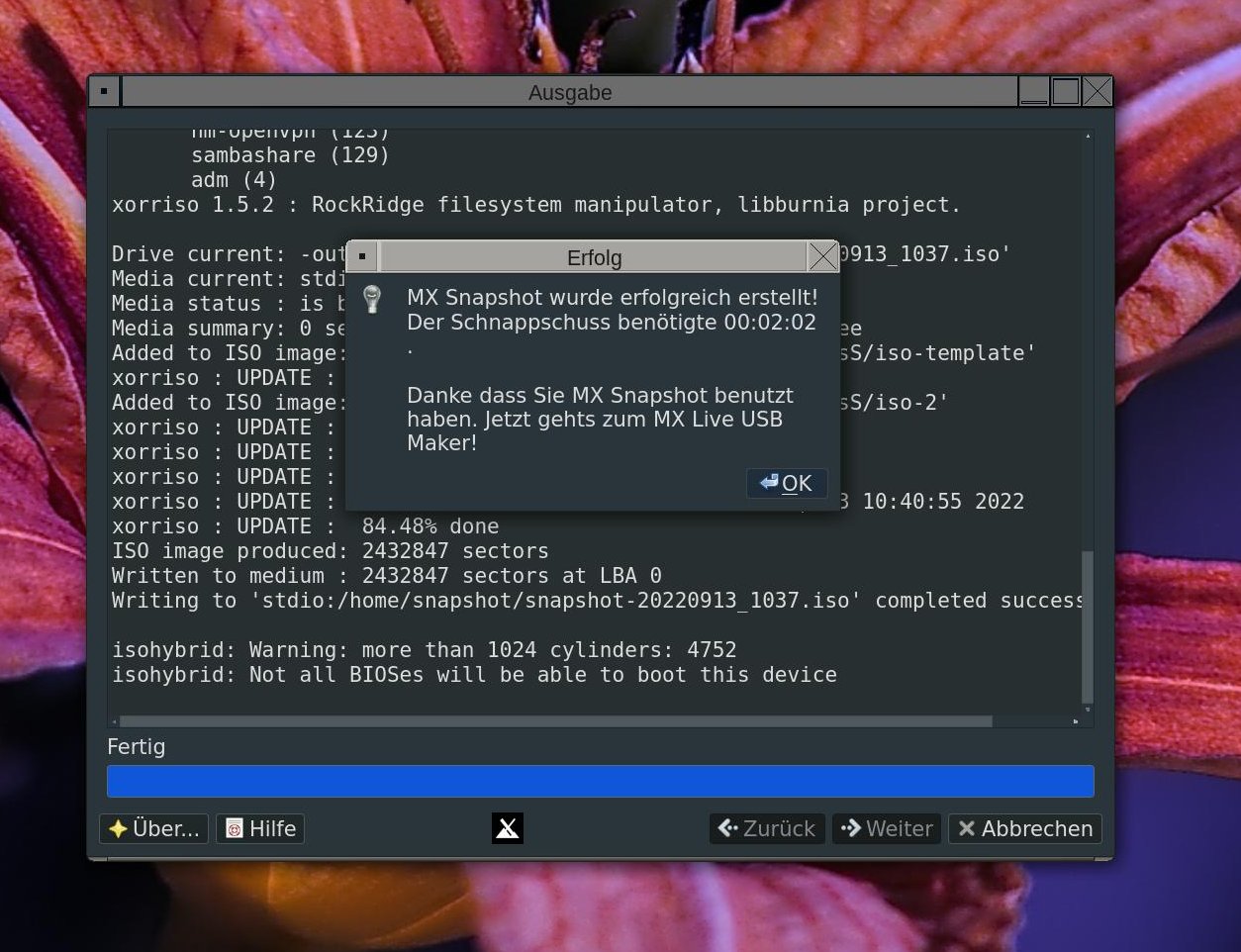 Mein aktueller mx-21 snapshot muss ~15GB verarbeiten und ist aktuell gerade um 5GB groß, wird in 2:02min erzeugt und in weniger als einer Minute auf einen USB3 Stick (sandisk extreme) geschrieben.
